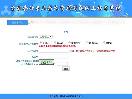 3、按要求選擇相應(yīng)的省份和證件類型,填寫(xiě)證件號(hào)碼、姓名以及驗(yàn)證碼,點(diǎn)擊“查詢”即可進(jìn)入初級(jí)會(huì)計(jì)準(zhǔn)考證打印頁(yè)面。
