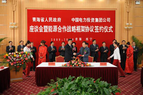 中電投集團公司與青海省政府在西寧簽署了《關于加強能源合作的戰略框架協議》。青海省委副書記、省長宋秀巖,青海省委常委、副省長徐福順,副省長駱玉林,省政府副秘書長鳥成云和集團公司黨組書記、總經理陸啟洲,集團公司總經理助理、辦公廳主任鄒正平,基建總工程師夏忠出席簽字儀式。陸啟洲與徐福順代表雙方在協議上簽字。