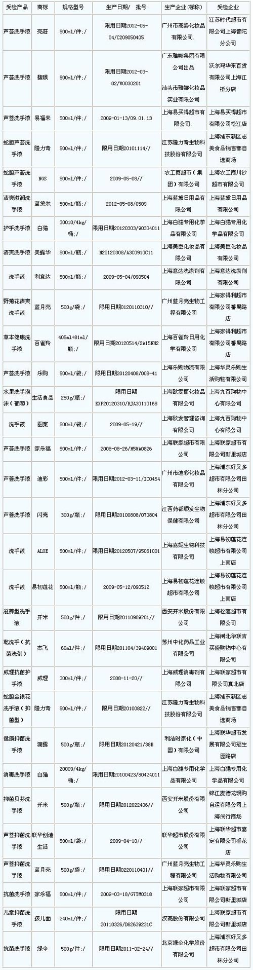 09年第2季度上海市洗手液質(zhì)量監(jiān)督抽查不合格產(chǎn)品