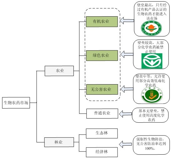 生物農(nóng)藥廣泛應(yīng)用于農(nóng)業(yè)、林業(yè)病蟲害防治領(lǐng)域。林業(yè)病蟲害防治對(duì)環(huán)保和生態(tài)平衡的要求最為嚴(yán)格,因此國(guó)家強(qiáng)制要求采用生物防治,生物農(nóng)藥在林業(yè)病蟲害防治占中據(jù)主導(dǎo)地位。國(guó)內(nèi)農(nóng)業(yè)市場(chǎng)按環(huán)保和食品安全等要素分為“普通農(nóng)業(yè)”、“無公害農(nóng)業(yè)”、“綠色農(nóng)業(yè)”和“有機(jī)農(nóng)業(yè)”四個(gè)等級(jí)不同的市場(chǎng),其中,“無公害農(nóng)業(yè)”、“綠色農(nóng)業(yè)”和“有機(jī)農(nóng)業(yè)”產(chǎn)品需國(guó)家認(rèn)監(jiān)委指定專門機(jī)構(gòu)認(rèn)定,對(duì)農(nóng)藥使用及殘留的標(biāo)準(zhǔn)非常嚴(yán)格。生物農(nóng)藥市場(chǎng)情況具體如下圖: