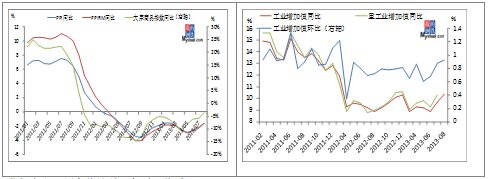 主要宏觀指標持續向好,為制造業復蘇奠定了基礎,鋼市有望在震蕩中尋找上行空間。PPI同比下降1.6%,降幅繼續超預期收窄,環比小幅上漲0.1%,這是自4月份以來首次由降轉升。PMI指數環比漲0.7%,連續11個月位于臨界點以上。分項數據來看,8月份生產指數為52.6,比前兩年8月都要高,新訂單、新出口訂單則是三年以來最高,而生產和新訂單指數的剪刀差明顯收窄也意味著目前供需矛盾有所緩解。新訂單指數較上月增長0.6個百分點至57.9%,顯示出我國鋼材需求保持穩定增長。CPI由于翹尾因素,同比漲2.6%,符合預期。值得一提的是,黑色金屬材料類無論是PPI還是PPIRM環比漲幅均位于行業前列。此前,國家發改委提出12條“軍規”,加鞭節能減排,要求以節能減排倒逼產業轉型和發展方式加快轉變,這在政策托底基礎上,無疑增強了工業企業的信心。規模以上工業增加值同環比繼續上揚,同比增長10.4%,環比漲0.93%。黑色金屬冶煉和壓延加工業同比漲13.6%,漲幅也位于主要行業前列。