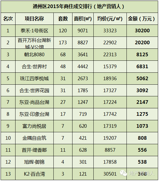 2015年至今通州區(qū)商住產(chǎn)品成交547套,成交面積34494㎡,成交均價(jià)23271元/㎡,成交金額8.02億元。