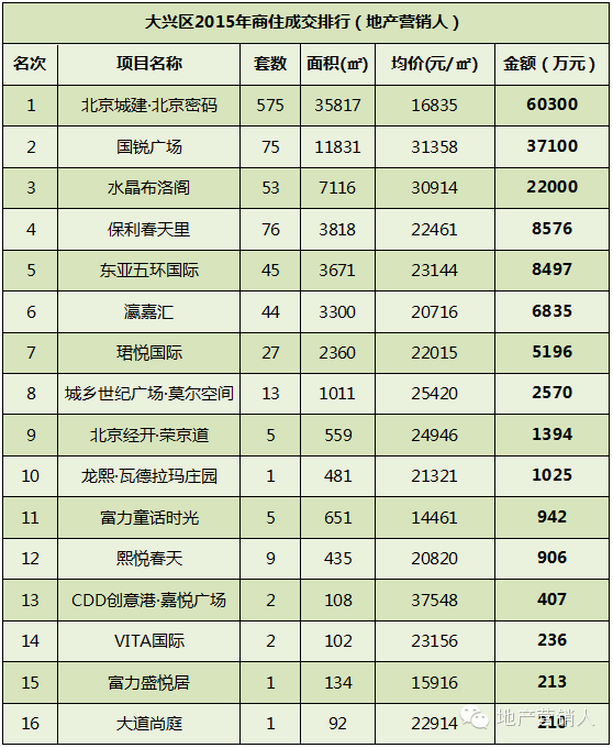2015年至今大興區(qū)商住產(chǎn)品成交934套,成交面積71486㎡,成交均價(jià)21879元/㎡,成交金額15.64億元。