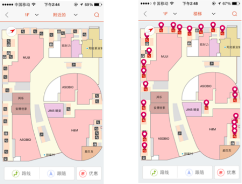 除了“會員”之外,新業匯O2O平臺還設有“商戶”“活動”“優惠”“地圖”“美食”“電影”“停車”等七大功能版塊。通過這些版塊可以迅速了解到各大商鋪的折扣信息,快速購買折扣電影票、餐飲折扣券等物品。其中最受歡迎的是室內地圖功能——打開新業匯App,點擊“地圖”就能獲取一份隨身的室內地圖,并通過商場免費WiFi或藍牙進行定位,獲取當前位置信息。不管是商鋪、洗手間、扶梯、服務臺還是停車場都能依靠實時導航功能輕松抵達。