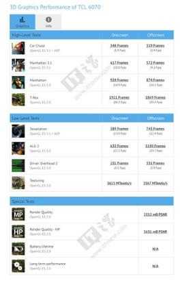 從下圖可以看出,這款TCL 6070在GFXBench曼哈頓離屏、曼哈頓OpenGL3.1離屏、霸王龍離屏以及CarChase最新場景下,分別跑出了14.4、9.2、33.4和5.4幀的成績。