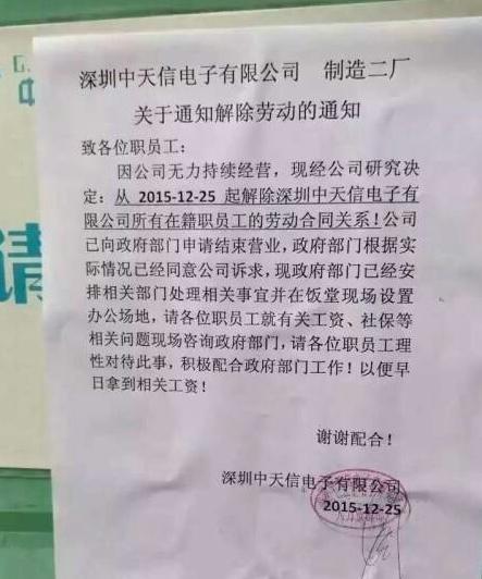 然而,目前網上流出了疑似中天信公司同員工解除勞動合同的通知,通知中稱“因公司無力經營,現經公司研究決定:從2015年12月25日起解除深圳中天信電子有限公司所有在籍職員的勞動合同關系。公司已經向政府部門申請結束營業,政府部門根據實際情況已經同意公司訴求”。如果該消息屬實,那么基本上就代表中天信公司已經倒閉。