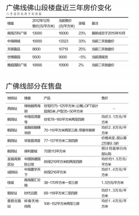 在二期開建這三年,廣佛兩地樓市客戶互動頗多,尤其是佛山去年放開限購以后,更有大量廣州客涌入佛山購房。在房價方面,佛山2012年12月在售的一手房至今除了佛山禪城周邊保持穩定外,與廣州接壤的南海區房價普漲兩三成。南都記者抽查廣佛線5個樓盤,其中起始魁奇路站的世博嘉園當前在清尾貨,對比三年前甚至降了5%。不過,距金融高新區地鐵站約15分鐘的中海錦城卻大漲33%。這與該盤自駕車到廣州方便不無關系。而位于南桂路地鐵站的南海萬科廣場由于起步售價高,漲幅在23%。