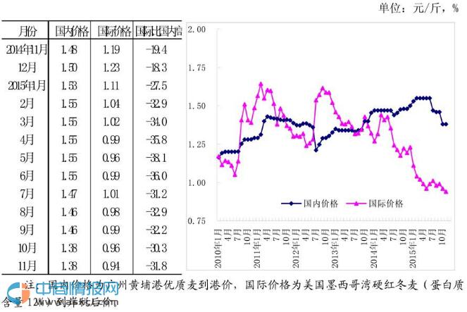 。ㄋ模﹪鴥韧鈨炠|麥價差再度擴大。11月份,美國墨西哥灣硬紅冬麥(蛋白質含量12%)離岸價直接折人民幣每斤0.68元,比優質麥產區批發價低0.66元;配額內1%關稅下到岸后價約每斤0.94元,比國內優質麥銷區價低0.44元,價差較上月擴大0.02元。