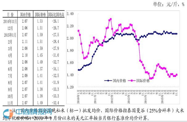 (四)國際大米到岸稅后價低于國內,價差縮小。11月份,配額內1%關稅下泰國大米到岸稅后價每斤1.40元,比國內晚秈米批發價每斤低0.67元,價差較上月縮小0.02元;離岸價折人民幣每斤1.15元,比國內低0.92元,低44.4%。