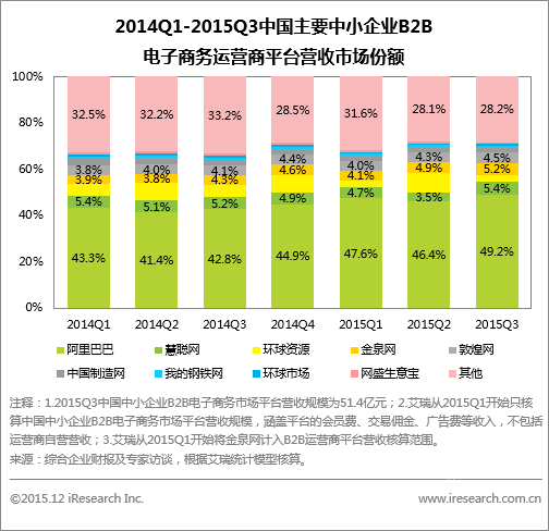 在2015Q3中國中小企業B2B電子商務運營商平臺營收市場份額中,9家核心企業占比為71.8%。其中,(1)阿里巴巴占B2B電子商務運營商平臺營收的比例為49.2%,優勢明顯;(2)慧聰網與金泉網分別位列二、三,占比分別為5.4%、5.2%。慧聰網的平臺營收市場份額較2015Q2有所上升;(3)其他B2B電子商務運營商表現相對平穩,市場份額變化不大。