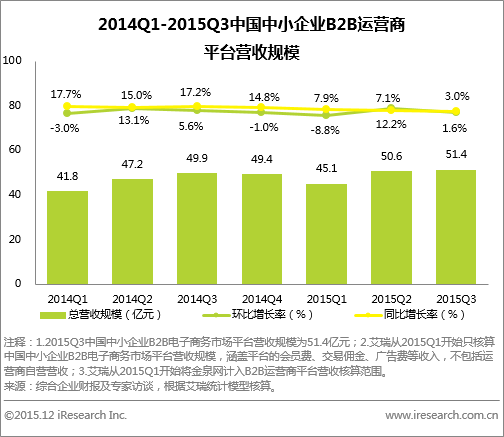 就季度而言,2015Q3中國中小企業B2B平臺服務營收規模為51.4億元,同比增長3.0%,環比增長1.6%。整體而言中小企業平臺服務營收規模同比增長不大。