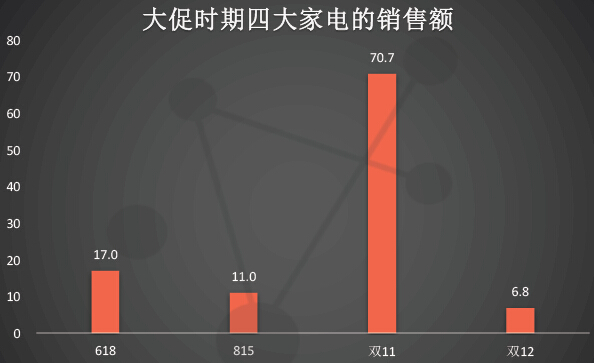 核心提示: 近日,星圖數據發布了《2015年四大電商節日盤點——大家電篇》。數據顯示,平板電視、冰箱、空調和洗衣機等四大家電在雙11期間銷售額達70.7億元,為平日銷售額近日,星圖數據發布了《2015年四大電商節日盤點——大家電篇》。數據顯示,平板電視、冰箱、空調和洗衣機等四大家電在雙11期間銷售額達70.7億元,為平日銷售額的10倍之多。