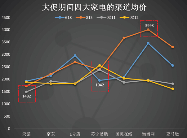 在均價方面,618、815時期四大家電的渠道均價明顯高于雙11、雙12期間,最高均價出現在815時期的當當網,高達3998元,最低均價出現在雙11時期的天貓,只有1482元,差距明顯。雖從年末傾銷庫存的角度看不難理解雙11、雙12期間均價較低,但正如上文家電銷售額趨勢所述,618和815的家電銷售優勢并不明顯,選擇在雙11時“孤注一擲”,進行大力度促銷,可能也是家電品牌商的無奈之選。