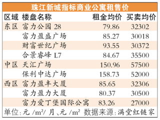 據滿堂紅鏈家金穗路分店店長魏曉軍介紹,珠江新城公寓最高價在中區,Loft設計的保利中達廣場月租金單價達158.73元/m2,旁邊的天鑾廣場則為150元/平,西區富力愛丁堡、東區合景睿峰L7的租金都在80~90元/平。從租金來看,保利中達廣場和天鑾廣場都租出超甲寫字樓的價格。