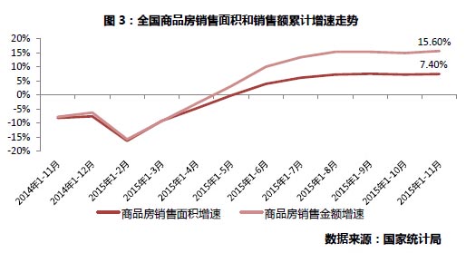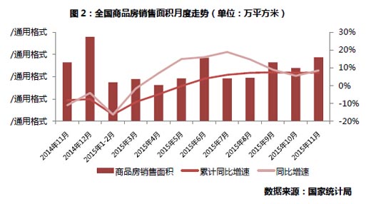 利好政策不斷落地,促使改善型需求集中釋放,今年商品房銷售筑底回升。1-11月份,商品房銷售面積109253萬平方米,同比增長7.4%,增速比1-10月份提高0.2個百分點。從全年走勢看,在3月商品房銷售降幅持續收窄,1-5月銷售額同比由負轉正后,三季度銷售面積開始同比正增長,實現了2014年年初以來的首次雙雙正增長,四季度在政策刺激力度加碼作用下,銷售面積增速加速上行。