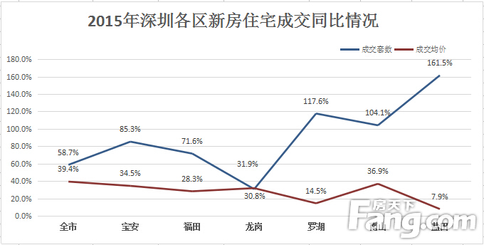 從1月到12月份的成交看,330新政后,深圳新房住宅成交量上漲明顯,6月份成交均價破3萬元,之后一直居高不下,11月份成交均價破4萬元,2015年深圳樓市火到了最后。提到2015年的深圳樓市,不得不提龍華新區。港鐵天頌、中海錦城、鴻榮源壹城中心等等,這些樓盤基本上開盤即“日光”,萬人搶房現場堪比演唱會,2015年深圳樓市的火爆,龍華新區貢獻了很大力量。