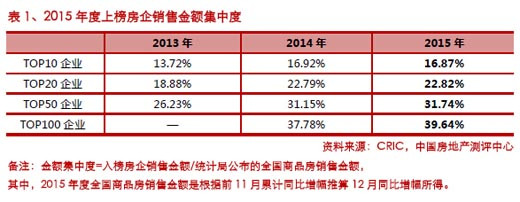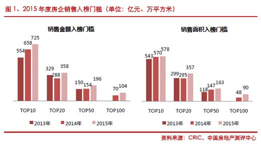 從金額門檻來看,今年TOP10房企入榜門檻為725億元,較2014年增加67億元,同比增長10%;TOP20房企金額門檻358億元,同比增長24%;TOP50房企金額門檻達到196億元,同比增長27%;TOP100房企的入榜門檻為104億元,同比增長48%。