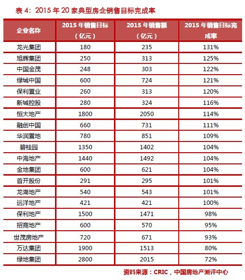 2015年20家典型房企的平均銷售目標完成率為98%,大部分房企的銷售情況符合年初預期。今年一季度房企的銷售情況并不樂觀,但二季度開始逐步好轉,三季度后一線和重點二線城市表現火爆、熱銷項目頻現,為房企全年業(yè)績作出了較大貢獻。由于銷售表現出色,11月起濱江、旭輝、保利置業(yè)等房企陸續(xù)宣布提前達標,恒大、中海和龍光在上調了銷售目標后,最終也都輕松完成任務。