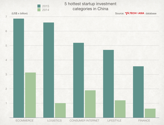 在2015年,中國的電商市場銷售占據零售市場總額的15.9%。據Emarketer預測,到2017年,將增長至23.8%。中國的網上用戶將撒出6720億美元的消費額,電商對投資人來說永遠是一個熱門領域。同樣,物流創業公司是第二大獲得投資金額的領域。以下是2015年五個獲得投資最多的領域: