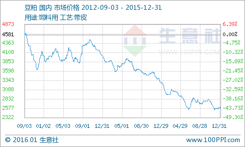 據監測數據顯示,自2012年9月初至今,國內豆粕價格呈震蕩下跌的走勢,2012年9月3日,國內豆粕均價為4581.00元/噸,2015年11月24日2535.33元/噸,跌幅達44.66%,是自2007年的2100元/噸左右的豆粕價格新低點,創近8年以來新低。