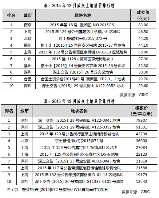 年末土地市場(chǎng)集中發(fā)力,上海、深圳表現(xiàn)搶眼。2015年12月,300城土地總價(jià)TOP10門檻為29.6億元,較11月份下降20%,僅南京建鄴區(qū)一幅地塊總價(jià)超過50億。在成交總價(jià)TOP10地塊中,一幅南京商住地塊和兩幅深圳純住宅地塊都是接近0溢價(jià)成交,其中南京建鄴區(qū)NO.2015G61地塊是為華僑城打造的文化旅游項(xiàng)目,限制條件較多,開發(fā)周期相對(duì)較長(zhǎng),僅三輪競(jìng)拍即告成交。其他地塊溢價(jià)率均在50%以上,上海奉賢區(qū)南橋鎮(zhèn)D-01-13區(qū)域地塊溢價(jià)率甚至達(dá)到220%,市場(chǎng)熱度可見。