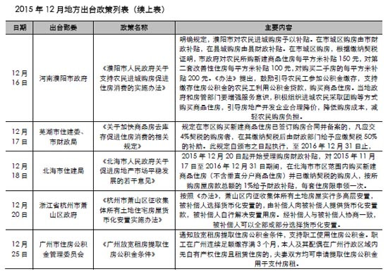 經(jīng)濟(jì)壓力漸顯的新常態(tài)下,在這新舊年交替之際,房地產(chǎn)行業(yè)受到前所未有的關(guān)注,不僅高層頻頻發(fā)聲,中央經(jīng)濟(jì)工作會(huì)議、中央城市工作會(huì)議等等也為來年樓市定調(diào)。明年房地產(chǎn)政策面仍將圍繞“去庫存”展開。地方政府層面,云南本月政策調(diào)整力度較大,不僅省物價(jià)局取消了商品房備案限制,省住建廳也發(fā)文允許居民使用公積金支付物業(yè)費(fèi)。同時(shí),昆明市政府圍繞“去庫存”出臺(tái)了24條意見,政策調(diào)整涉及公積金貸款額度上調(diào)、加強(qiáng)棚改貨幣化安置、允許部分地塊調(diào)整規(guī)劃等等,政策力度較大。此外安徽、濟(jì)南等省市也就“去庫存”問題在棚改和稅費(fèi)優(yōu)惠等方面有所動(dòng)作。而樓市需求相對(duì)較為旺盛的江蘇省,本月出臺(tái)了價(jià)格條例草案,房?jī)r(jià)上漲過快的物價(jià)局可約談房企,各地政策略顯多樣化趨勢(shì)。
