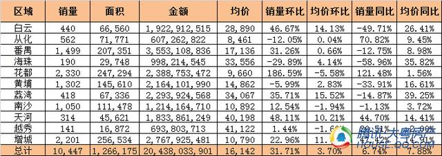 郊區方面,除了從化區,其余4區均呈現上漲的態勢。花都區成交2330套,上漲186%,當之無愧成為廣州市12月區域銷冠。主要是因為,廣州萬達文化旅游城實現1328套的成交總額,扛起了花都區網簽成交量的半壁江山。其次,增城區累計成交2201套,與花都區一起成為上月成交破2000套的區域。主要是因為12月全新開盤的碧桂園鳳凰城旗開得勝,以均價13203元/平成交了606套,拉高了區域整體成交和均價。