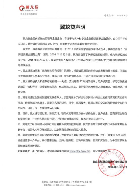 以下為翼龍貸聲明全文:
