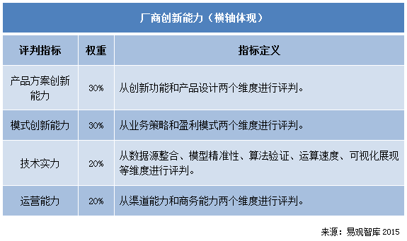 Analysys易觀智庫分析認為,中國金融大數據在中國現有各類線下金融機構和個人用戶中的滲透率正在快速提升,未來仍將處于快速發展階段,而線上用戶的應用正處于市場初期,各類新業務模式在不斷探索。由于不同金融細分領域的業務方向差異顯著,對創新性的要求也不盡相同?傮w而言,產品方案創新能力、模式創新能力、技術實力、運營能力是評價廠商現有創新能力的重要指標。
