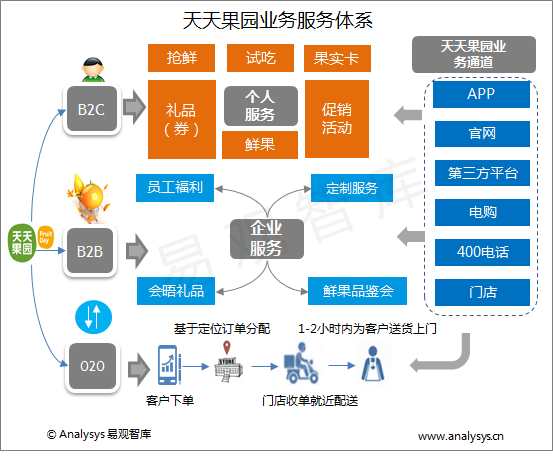 天天果園涉足生鮮領(lǐng)域多年,過早奠定了其行業(yè)領(lǐng)先地位,已經(jīng)形成了較為完善的業(yè)務(wù)生態(tài)和客戶服務(wù)體系;主營高端水果,定位中高端客戶群體。天天果園與世界水果品牌及政府機(jī)構(gòu)建立長期合作關(guān)系,在品牌影響力與產(chǎn)品質(zhì)量層面有了充足保障,同時(shí)天天果園通過自建物流體系來保障其在配送端的優(yōu)勢;依托線下門店布局線上線下結(jié)合的“O2O生態(tài)”。