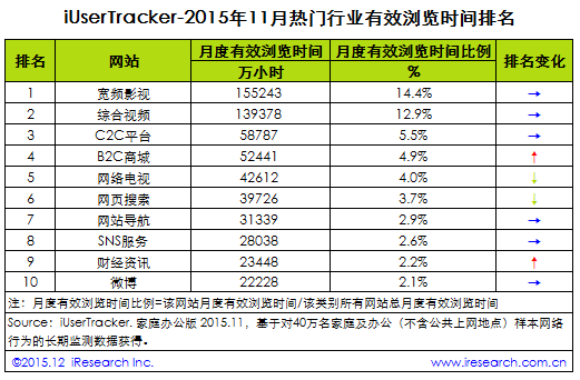 根據艾瑞iUserTracker最新監測數據顯示,2015年11月,寬頻影視有效瀏覽時間達15.5億小時,為本月網民有效瀏覽時間最高的服務;綜合視頻有效瀏覽時間達13.9億小時,位居第二;C2C平臺有效瀏覽時間達5.9億小時,位居第三,三者合計占總有效瀏覽時間的32.8%。