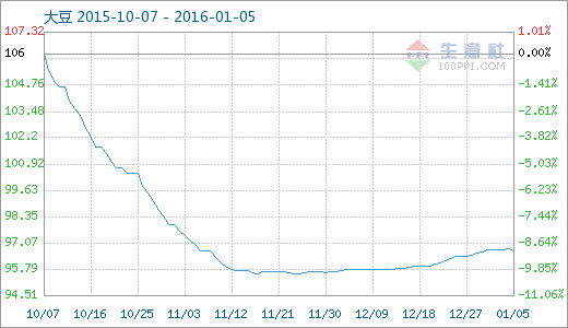 據(jù)生意社了解,12月份以來,東北產(chǎn)區(qū)大豆市場(chǎng)價(jià)格持續(xù)小幅回暖,進(jìn)入2016年1月份,產(chǎn)區(qū)大豆市場(chǎng)價(jià)格小幅下滑,帶動(dòng)大豆商品指數(shù)小幅下跌0.07點(diǎn)。