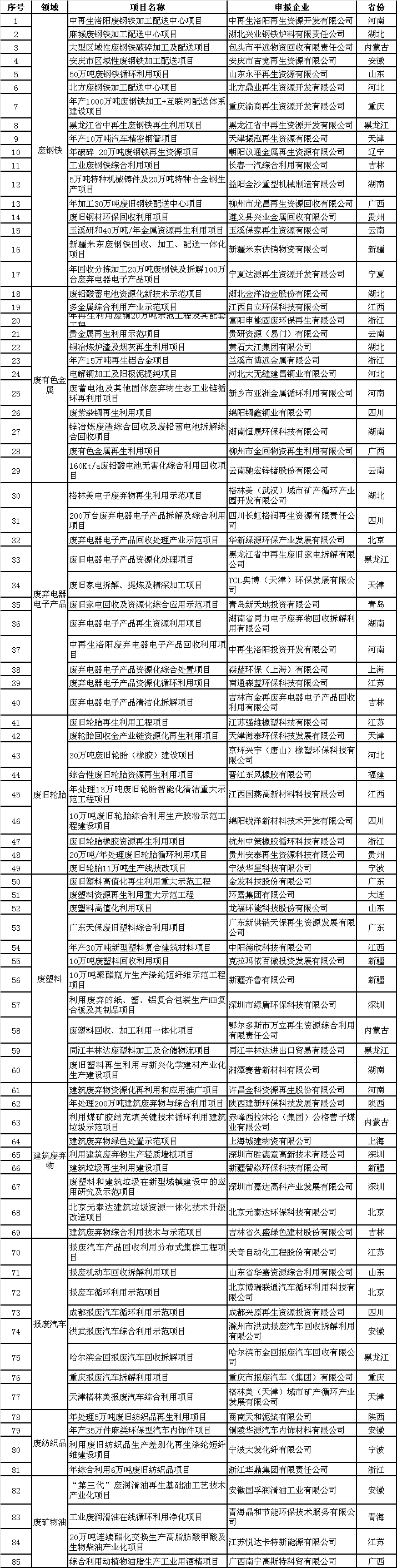 此次公示的名單包括85個示范工程,示范項目選擇范圍包括廢鋼鐵、廢有色金屬、廢舊輪胎、廢塑料、廢油、廢舊紡織品、建筑廢棄物、廢棄電器電子產品、報廢汽車等資源再生利用。