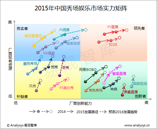根據Analysys易觀智庫發布的《2015年中國秀場娛樂市場實力矩陣專題研究報告》顯示,Analysys易觀智庫對2014年至2016年主要秀場娛樂業務廠商在實力矩陣中所處的位置以及廠商現有資源和創新能力的變化情況做如下解讀。
