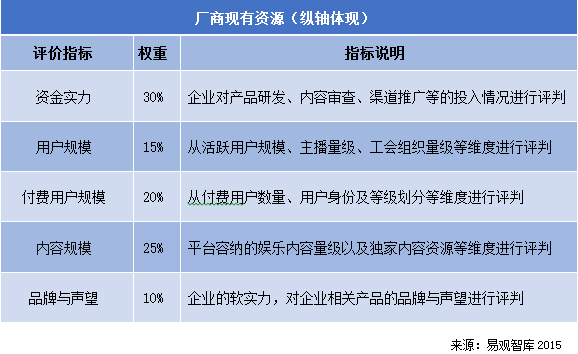 Analysys易觀智庫分析認為,中國秀場娛樂市場格局已經基本穩定,在深耕多年的幾家老牌秀場業務廠商與發力移動端秀場業務的新晉企業之間競爭,現有企業之間的競爭更多體現的是現有資源博弈。而資金實力、用戶規模、付費用戶規模、內容規模、品牌與聲望四個維度是評價從業廠商現有資源能力的重要指標。
