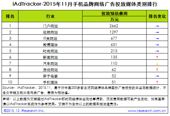 2015年11月手機(jī)品牌網(wǎng)絡(luò)廣告投放費(fèi)用達(dá)6291萬(wàn)元