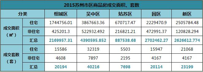 據克而瑞蘇州機構數據統計,2015年蘇州市區(不包括吳江)商品房累計成交111421套,同比去年上漲26.96%,成交面積為12777166.89㎡。其中住宅共計成交90423套,同比去年增加27764套,增幅高達44.31%,成交面積為11018392.22㎡。非住宅成交20998套,成交面積1758774.67㎡。