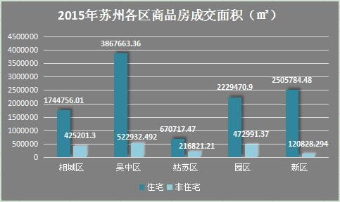 從蘇州各區(不包括吳江)商品房成交面積來看,吳中區顯然是成交大頭,2015年住宅累計成交面積386.77萬方,成交量高達姑蘇區5倍之多,當然其非住宅成交面積也是位居五區之首;其次是新區,住宅共計成交面積250.58萬方,不過非住宅成交面積并不樂觀,共計成交12.08萬方,在五個區之中成交量最低。由于市場向暖,相城區和園區成交也都不錯,無論是住宅、還是非住宅,成交情面積都比較樂觀。