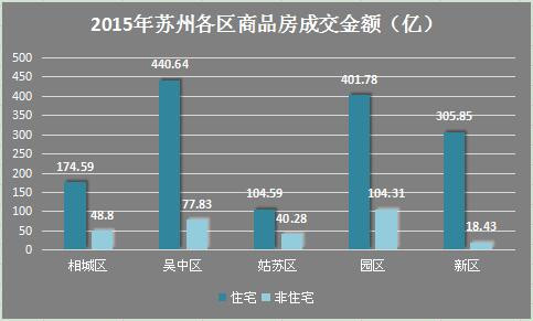 另外由克而瑞蘇州機構統計的數據顯示,截止2015年12月30日,蘇州全市(不包括吳江)商品房成交金額共計1717億元。其中吳中區商品房累計成交金額440.64億元,為蘇州市區之首,這主要得益于吳中區遙遙領先的商品房成交面積和成交套數。而園區以401.78億元的成交金額位居第二,雖然園區成交面積和成交套數都遠遠落后于吳中區,但成交金額與吳中區僅僅相差30億元。如此對比來看,顯然很容易就能感受到園區房價之高。另外新區2015年商品房成交305.85億元,排在第三;而姑蘇區原本成交面積和成交套數都遠遠不如其它幾個區域,因而成交金額也是最少,其中住宅成交金額僅104.59億元。