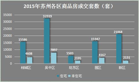 從主城各區(不包括吳江)商品房的成交套數來看,不論是住宅還是非住宅,吳中區都是遙遙領先,其中住宅共計成交32319套,比第二名的新區的成交套數高出11251套。相城和園區成交套數大體相當,分別為15586套和15947套,而古城區由于庫存量稀缺,2015年住宅和非住宅成交量都不是太高。