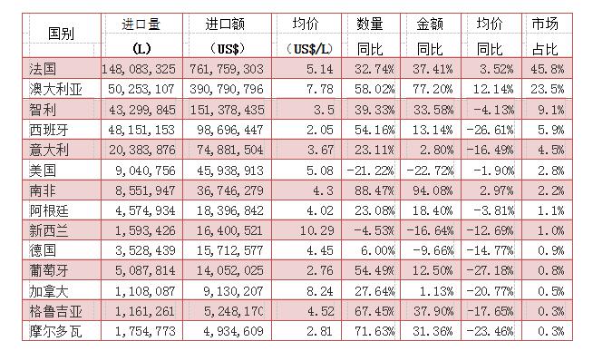 (表為原瓶裝葡萄酒進(jìn)口來源地情況)