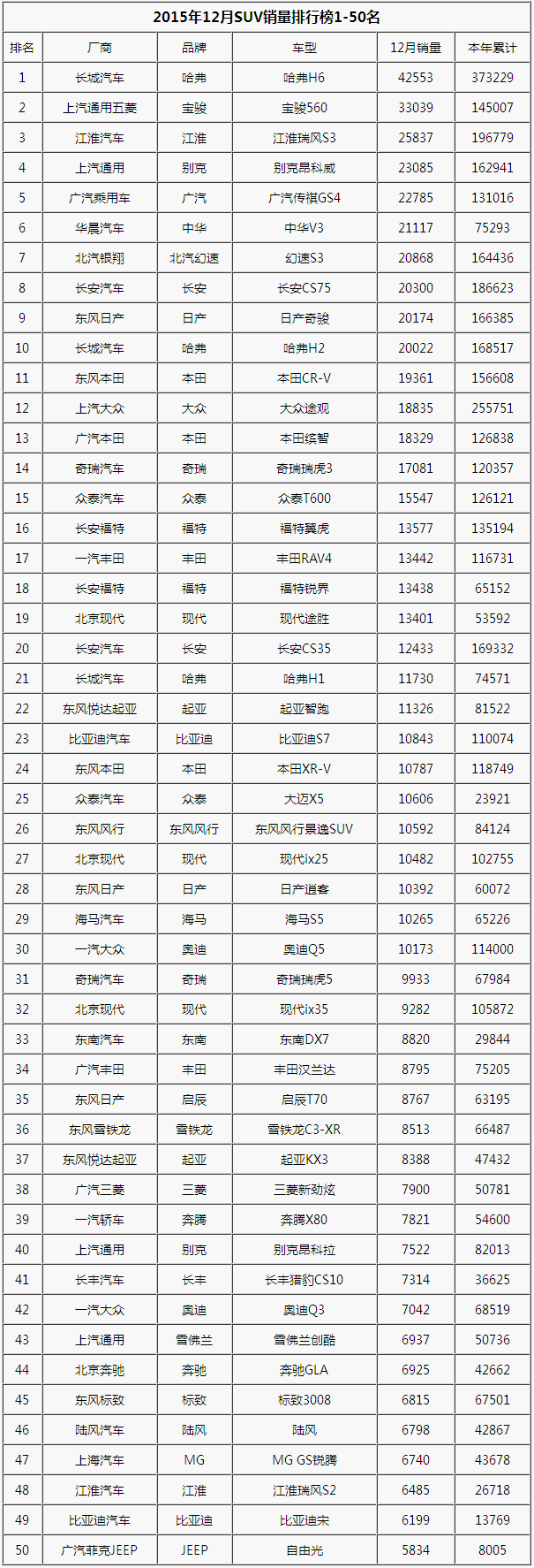 2015年12月中國SUV銷量排行榜完整名單出爐(1-50)