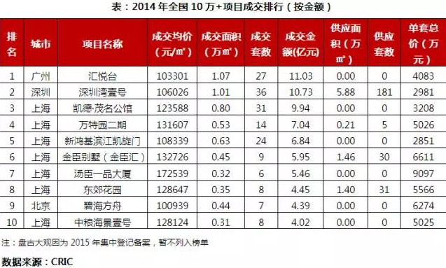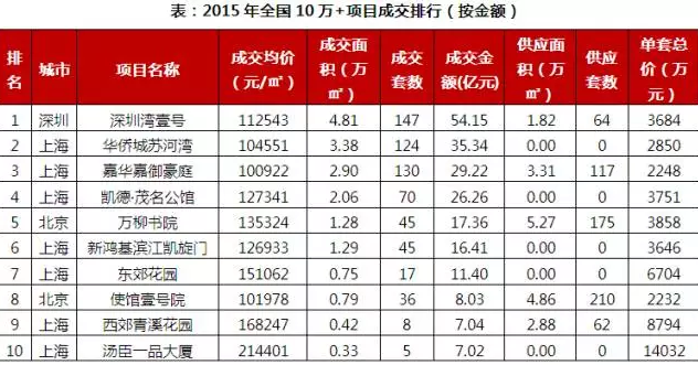特征2:各項(xiàng)目單價(jià)明顯上漲。整體來(lái)看,TOP10項(xiàng)目的成交平均價(jià)格變化不大,2014、2015年均為11.8萬(wàn)元/平方米。但從各項(xiàng)目?jī)r(jià)格表現(xiàn)來(lái)看,還是有顯著上漲,如榜首深圳灣壹號(hào)均價(jià)上漲了6%,而湯臣一品平均售價(jià)更是上漲了24%,突破了20萬(wàn)元/平方米的大關(guān)。