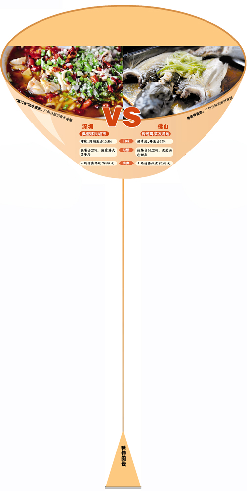 兩地飲食口味的差異,或源于人口比例構成。根據2014年9月公安部門的統計,目前佛山常住人口已經超過800萬,其中登記在冊的流動人口有422多萬,外來人口比例為52%。而深圳是一座“移民城市”,2013年末,深圳市常住人口1062.89萬人,其中戶籍人口310.47萬人,外來人口比例高達70.79%。人口的多元化也導致深圳人的飲食習慣更加多元化。