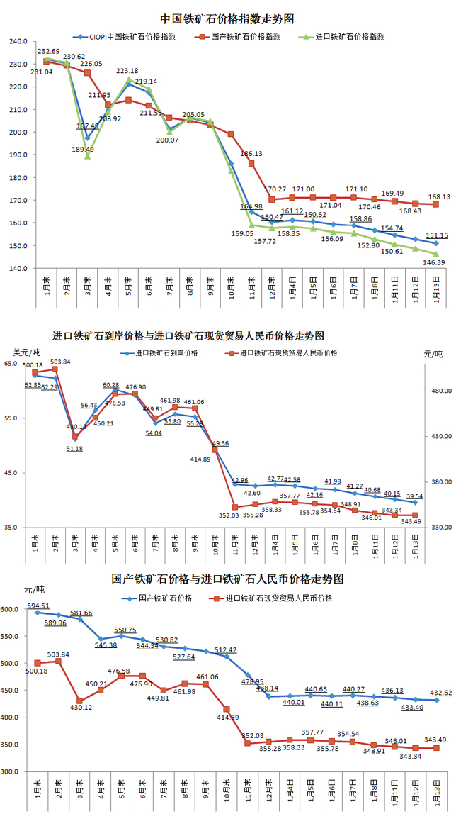 1月13日,中國鐵礦石價格指數(CIOPI)151.15點,環比下降1.83點,降幅為1.20%。其中:國產鐵礦石價格指數為168.13點,環比下降0.30點,降幅為0.18%;進口鐵礦石價格指數為146.39點,環比下降2.26點,降幅為1.52%。