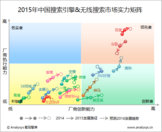 根據(jù)analysys易觀智庫近期發(fā)布的《2015年中國搜索引擎&無線搜索市場實力矩陣專題研究報告》,易觀對2014-2016年中國搜索引擎&無線搜索市場廠商在實力矩陣中所處的位置以及執(zhí)行能力和創(chuàng)新能力的變化情況作如下解讀:
