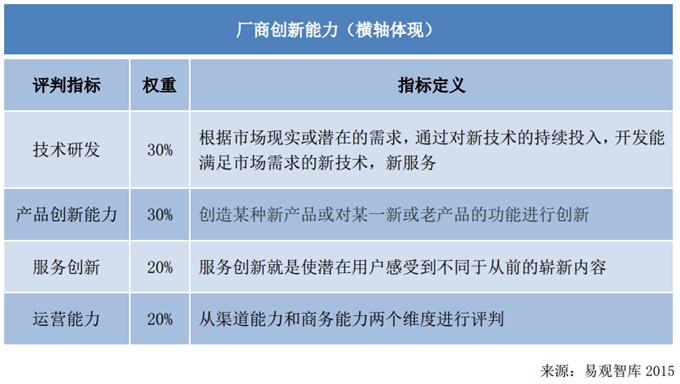 Analysys易觀智庫分析認(rèn)為,中國搜索引擎&無線搜索市場目前正處于成熟階段,在此階段市場KSF中,能夠推動產(chǎn)業(yè)發(fā)展的廠商創(chuàng)新能力體現(xiàn)在技術(shù)研發(fā)、產(chǎn)品創(chuàng)新能力、服務(wù)創(chuàng)新、運營能力四個個方面。
