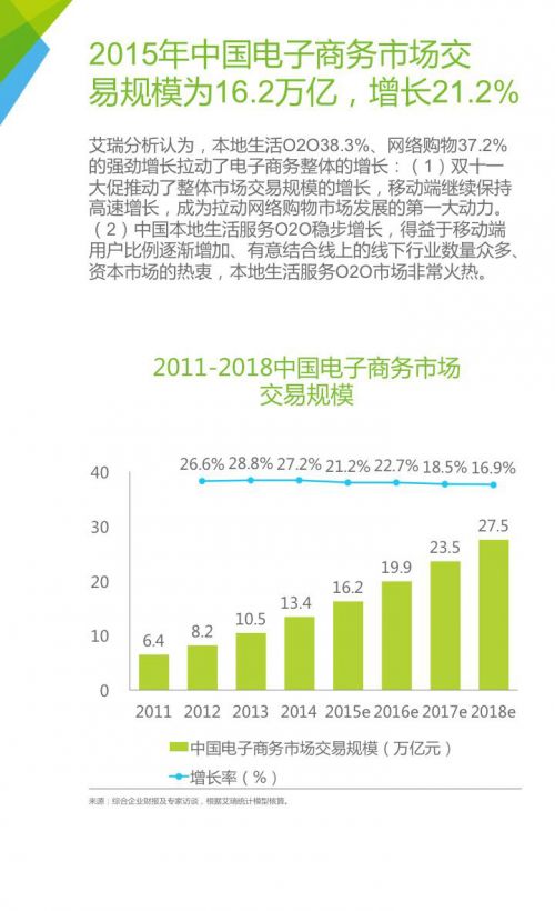 核心提示: 2015年中國電子商務市場交易規模達16.2萬億,增長21.2%。本地生活O2O38.4%、網絡購物37.2%的強勁增長拉動了電子商務整體的增長。艾瑞咨詢年度2015年中國電子商務市場交易規模達16.2萬億,增長21.2%。本地生活O2O38.4%、網絡購物37.2%的強勁增長拉動了電子商務整體的增長。