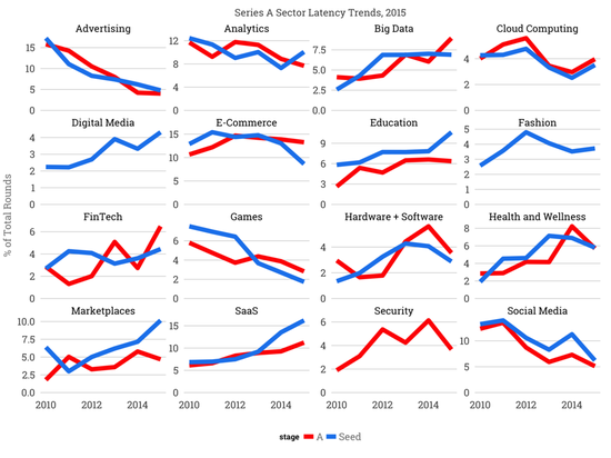 網上市場從起初的2.5%飆升到了期末的10%,主要是受到了Uber、AirBnb這些公司大獲成功的鼓舞。論市值Uber是全世界最大的出租車公司,可自己卻沒有一輛出租車,AirBnb是全世界最大的酒店業主,可連一間自己的房間都沒有。這些企業令人瞠目結舌的增長率和規模讓投資者不斷去追捧新鮮新穎的投資門類,與此同時,A輪投資者仍穩定在5%的投資份額。考慮到投資者對種子輪的興趣,預計這些市場里面很多都會在2016年融到A輪。
