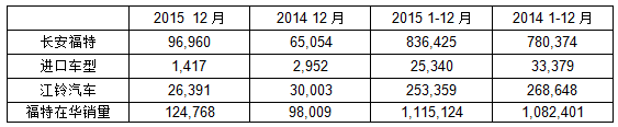 福特汽車在華乘用車合資企業長安福特2015年銷量及12月銷量也創下了記錄,累計年銷量達到836,425輛,相比2014年上升7%;長安福特十二月份的銷量為96,960輛,較2014年同期勁增49%。